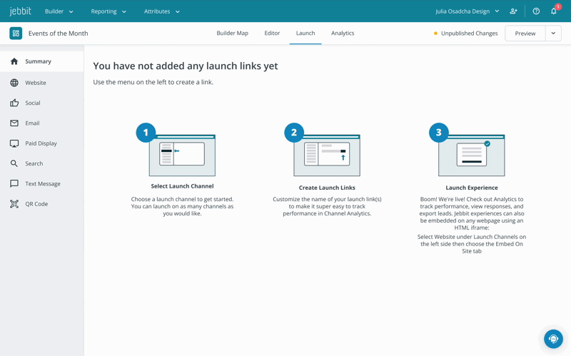 Jebbit's Launch feature enables marketers to distribute interactive experiences across multiple channels: social, email, paid ads, SMS, QR codes, and more, while tracking performance with UTM parameters, pixels, and user IDs.