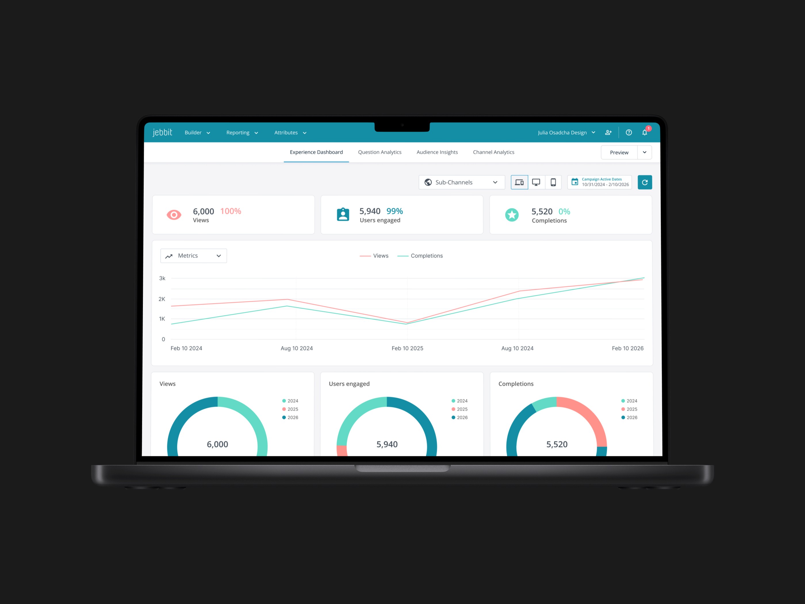Jebbit is a no-code platform for building interactive consumer experiences (quizzes, product finders, surveys) that power zero- and first-party data collection for enterprise brands. During my two years on the product team, I designed and shipped dozens of features used by clients including L'Oréal, Pepsi, NARS, and PwC, in a high-velocity environment where features moved from concept to production on weekly cycles.